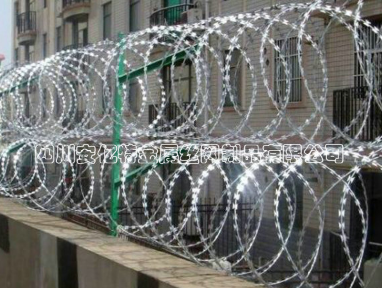 刀片刺繩由熱鍍鋅鋼板或不銹鋼薄板沖壓出尖利的刀片狀,高張力鍍鋅鋼絲或者不銹鋼絲做芯線組合而成的阻絕器件。因?yàn)榇叹W(wǎng)造形共同不易觸摸,因而能達(dá)到極好的防護(hù)阻隔作用。