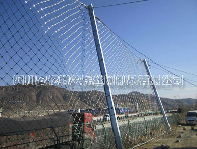 被動防護(hù)網(wǎng)材質(zhì):鋼絲繩網(wǎng)、支撐繩和減壓環(huán)結(jié)構(gòu):由鋼絲繩網(wǎng)或環(huán)形網(wǎng)(需阻攔小塊落石時附加一層鐵絲格柵)、固定體系(錨桿、攔錨繩、基座和支撐繩)、減壓環(huán)和鋼柱四個首要部分構(gòu)成。